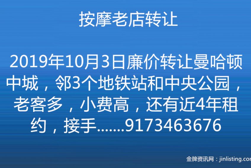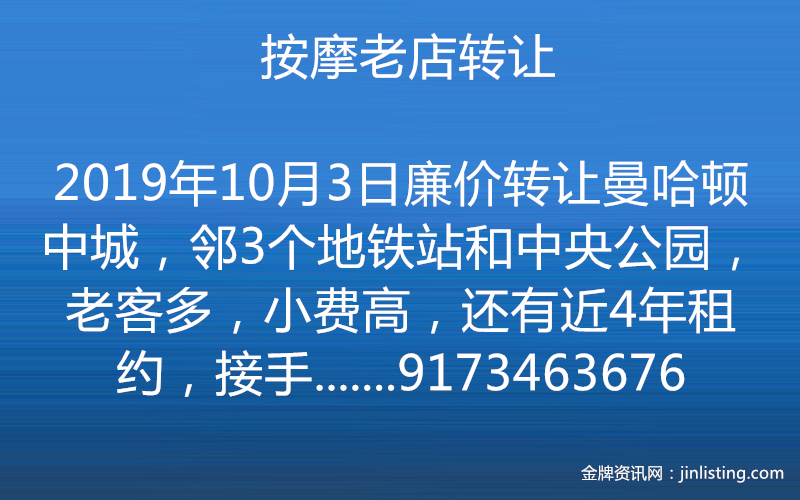 廉价转让曼哈顿中城按摩老店转让,邻3个地铁站和中央公园,老客多,小费高,还有近4年租约,接手就赚,3个房间,其中2个房间有洗手池,房租3800,转让费37000(含底压金),因个人原因忍痛急转,签租约需看大牌执照。 9173463676