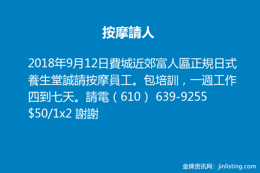 費城近郊富人區正規日式養生堂誠請按摩員工。包培訓,一週工作四到七天。請電(610) 639-9255