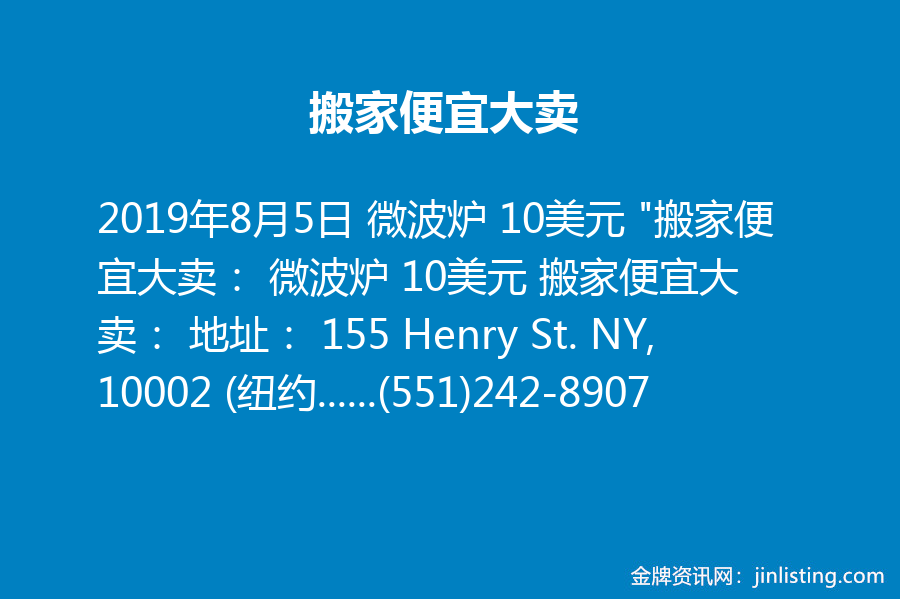 微波炉 10美元 “搬家便宜大卖: 微波炉 10美元 搬家便宜大卖: 地址: 155 Henry St. NY, 10002 (纽约 唐人街 East broadway F线地铁站) Tel: (551)242-8907 (请发送短信)”