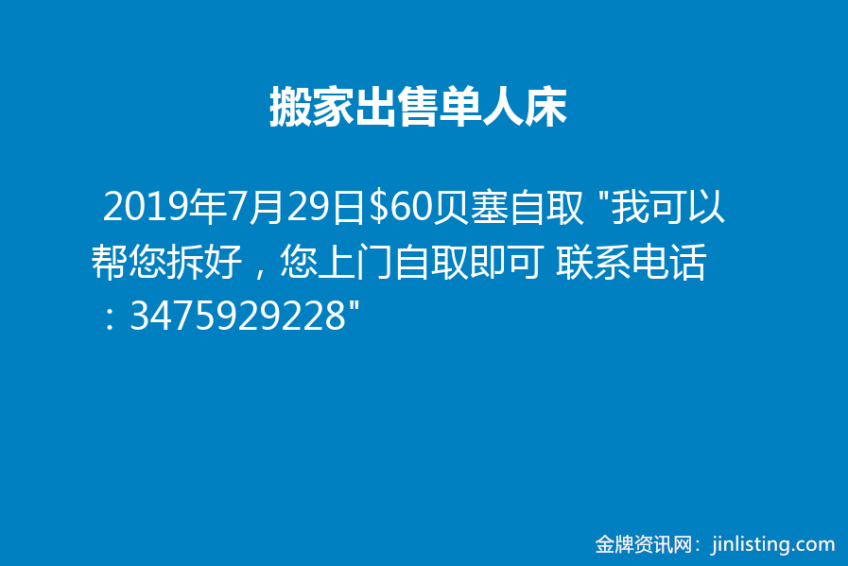 搬家出售单人床,$60贝塞自取 “我可以帮您拆好,您上门自取即可 联系电话:3475929228”