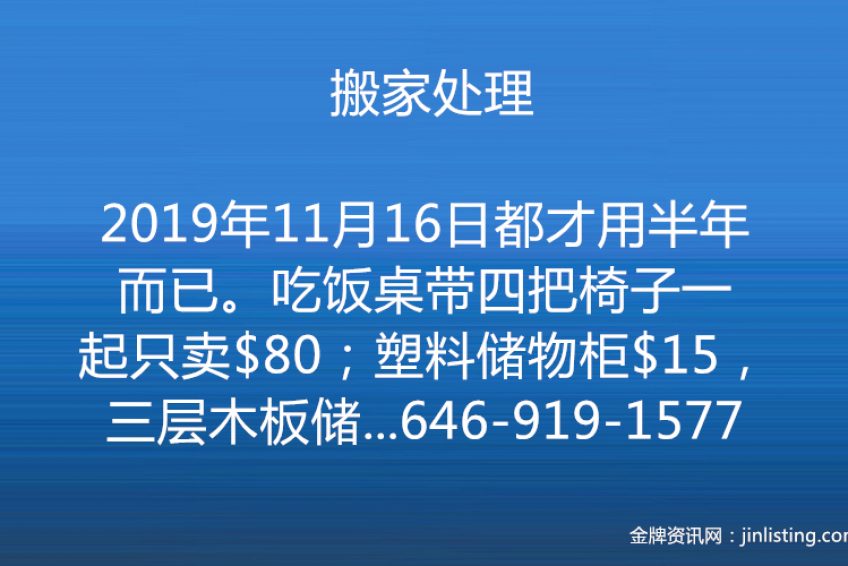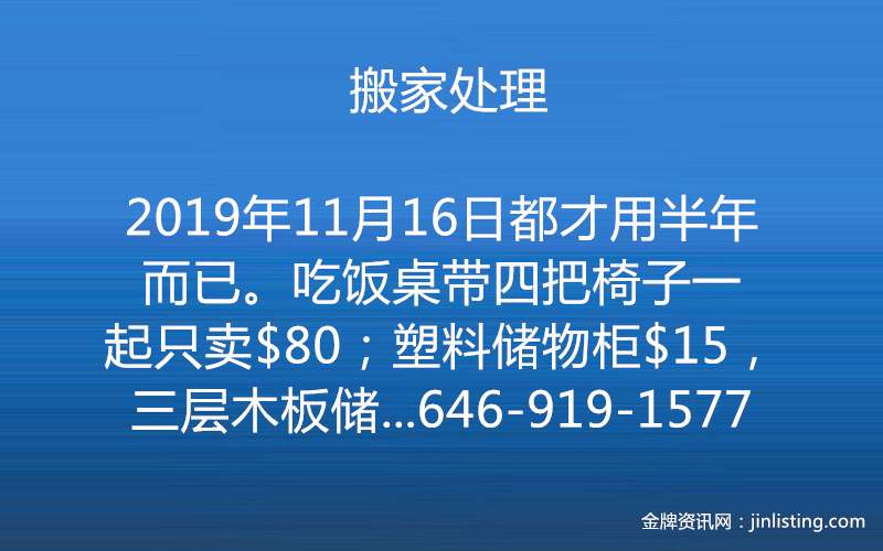 搬家处理,都才用半年而已。吃饭桌带四把椅子一起只卖$80;塑料储物柜$15,三层木板储物架$10.新鲜草原自取,电话646-919-1577