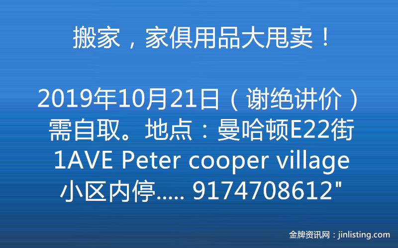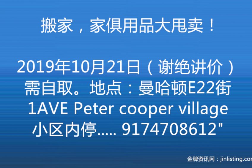 “搬家,家俱用品大甩卖!(谢绝讲价) 需自取。 地点:曼哈顿E22街 1AVE Peter cooper village 小区内停车很方便,可免费停车40分钟! 1、英式复古布面双人沙发 60刀, 2、白色四斗柜40刀 3、高腿折叠椅10刀/只(有2只) 4、电视柜全套50刀 5、白色大衣柜50刀 6、国航专用宠物拖运箱20刀 7、电脑桌30刀 8、白色下半截玻璃门书架20刀 其余物品一律5-10刀/件!!!! 联系电话 RAY先生 9174708612”