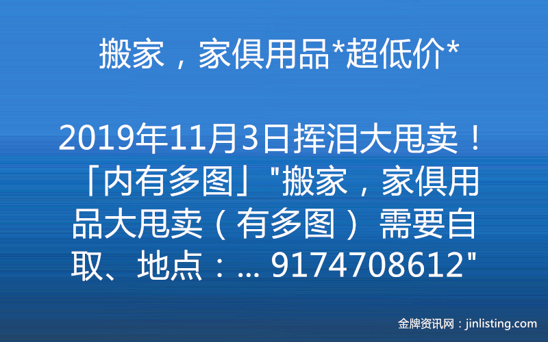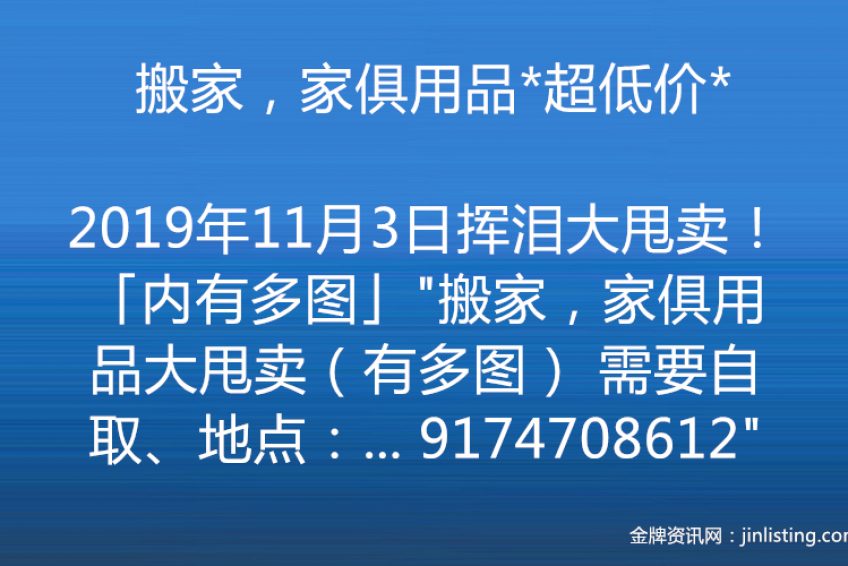 搬家,家俱用品*超低价*挥泪大甩卖!「内有多图」 “搬家,家俱用品大甩卖(有多图) 需要自取。。。。。。、 地点:曼哈顿1AVE E22街 Peter cooper village 小区内停车很方便,可免费停车40分钟! 1、英式 IKEA 复古布面双人沙发 60刀,【内藏折叠双人床,非常实用!】 2、IKEA高品质白色四斗抽屉柜 40刀 3、高腿折叠椅10刀/只(有2只) 4、2米X2米双人大床 含高级舒适床垫 100刀 5、IKEA白色大衣柜 50刀 6、国航专用宠物拖运箱15刀 7、电脑桌30刀 8、白色下半截玻璃门书架20刀 9、床头柜10刀/只(有2只) 其余小件物品5-10刀/件起售!!!! 联系电话 RAY先生 9174708612”