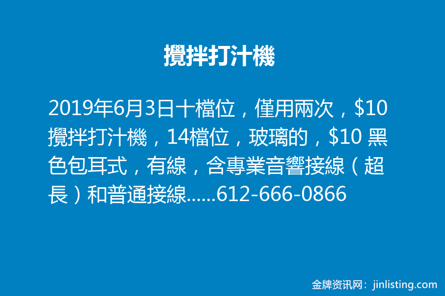 “攪拌打汁機,十檔位,僅用兩次,$10 攪拌打汁機,14檔位,玻璃的,$10 黑色包耳式,有線,含專業音響接線(超長)和普通接線, 包裝全 $10 無線藍色耳麥,含USB充電線,$10 坐標:布魯克林八大道交70街自取,自取,自取 電話:612-666-0866可接簡訊”