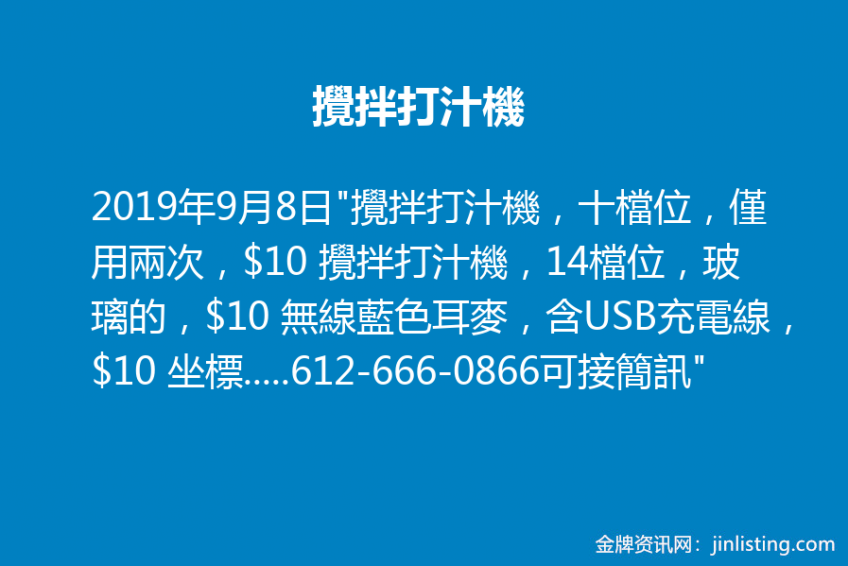 “攪拌打汁機,十檔位,僅用兩次,$10 攪拌打汁機,14檔位,玻璃的,$10 無線藍色耳麥,含USB充電線,$10 坐標:布魯克林八大道交70街自取,自取,自取 電話:612-666-0866可接簡訊”