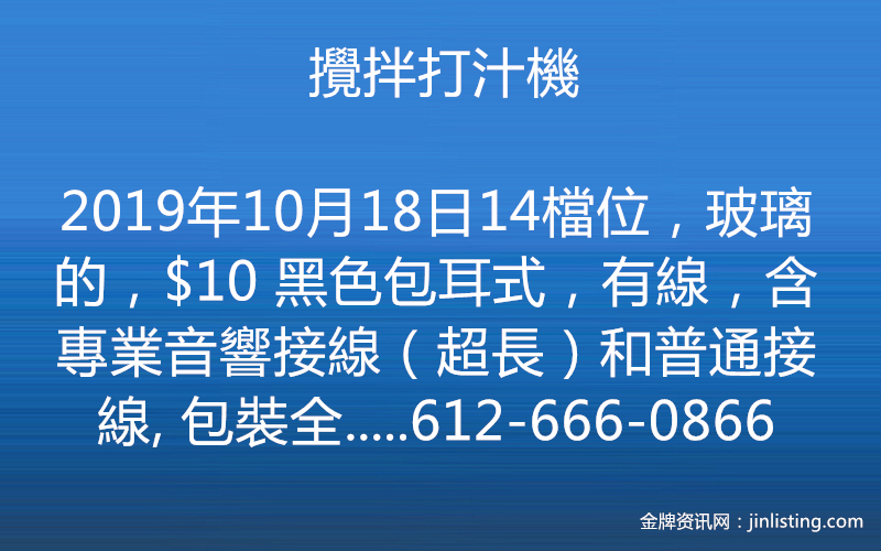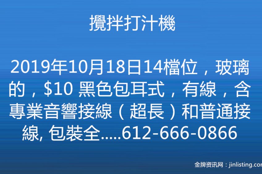 “攪拌打汁機,14檔位,玻璃的,$10 黑色包耳式,有線,含專業音響接線(超長)和普通接線, 包裝全 $15 坐標:布魯克林八大道交70街自取,自取,自取 電話:612-666-0866可接簡訊”