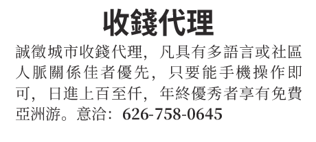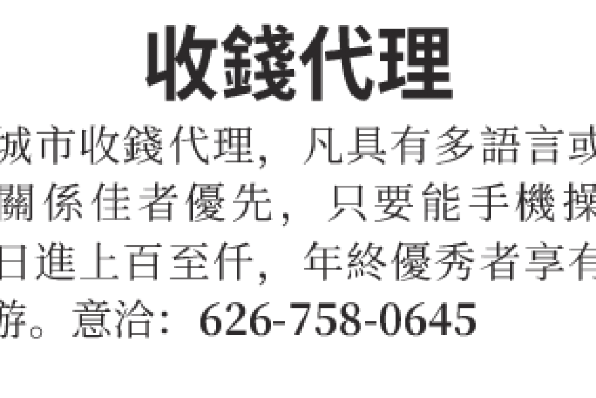 誠徵城市收錢代理,凡具有多語言或社區人脈關係佳者優先,