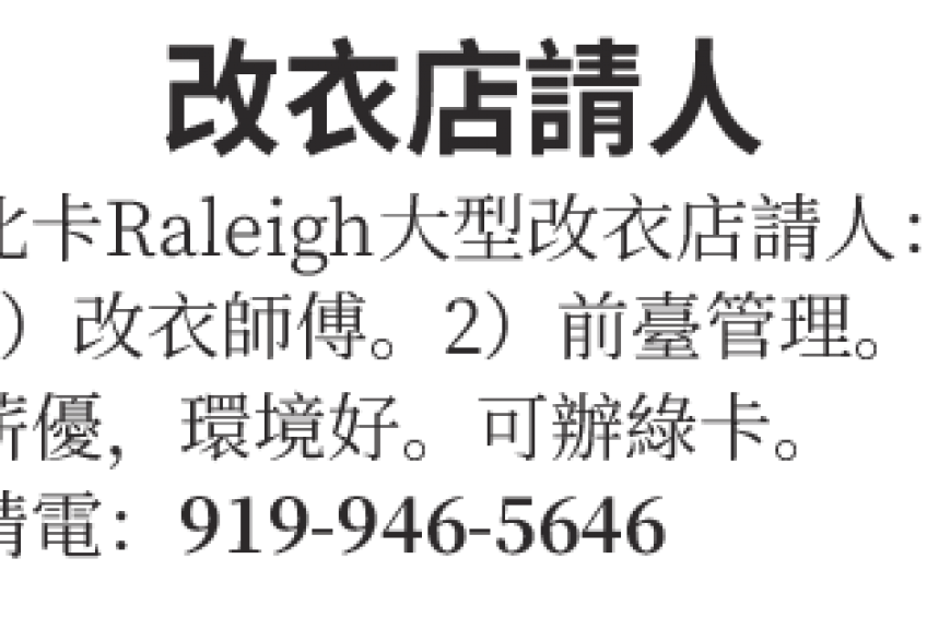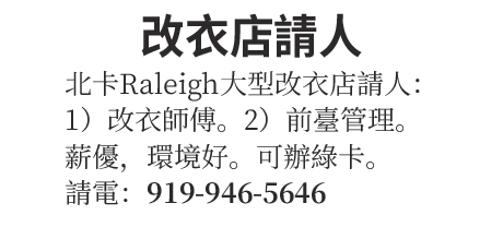 北卡Raleigh 大型改衣店请人:1. 改衣师傅。 2, 前台管理。薪优环境好。可办绿卡。请电919-946-5646