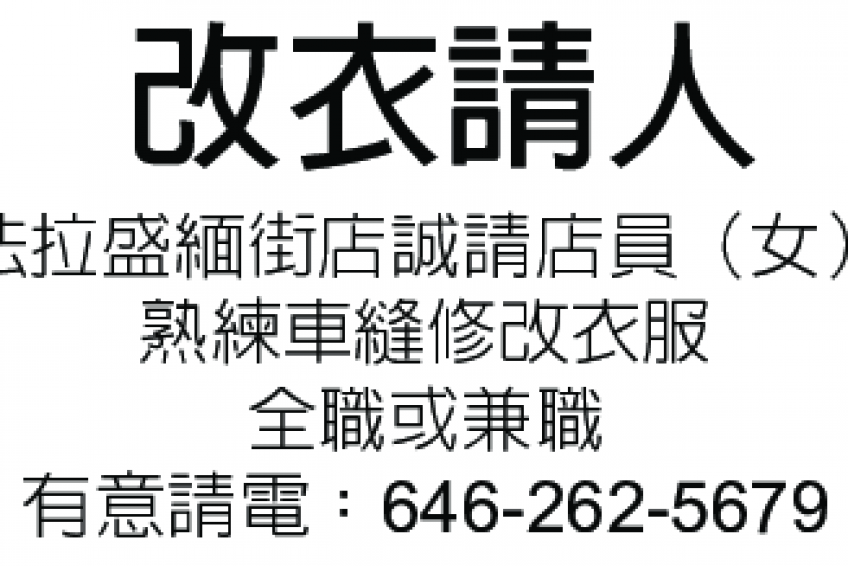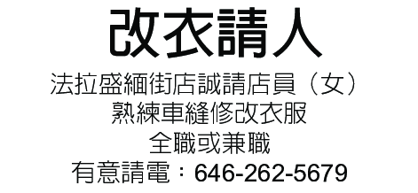 法拉盛緬街店 誠請熟練車縫修改衣服店員(女)全職或兼職 646-262-5679