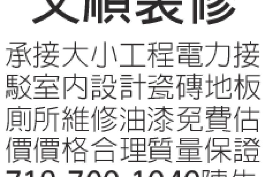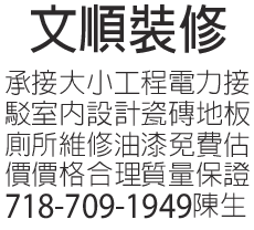 承接大小工程,電力接駁,室內設計,瓷磚地板和廁所維修,油漆免費估價,價格合理,質量保證718-709-1949,陳生