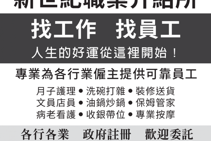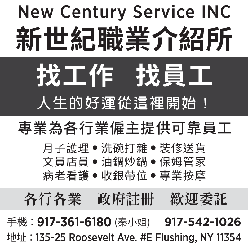 新世紀職業介紹所 917-361-6180 917-542-1026