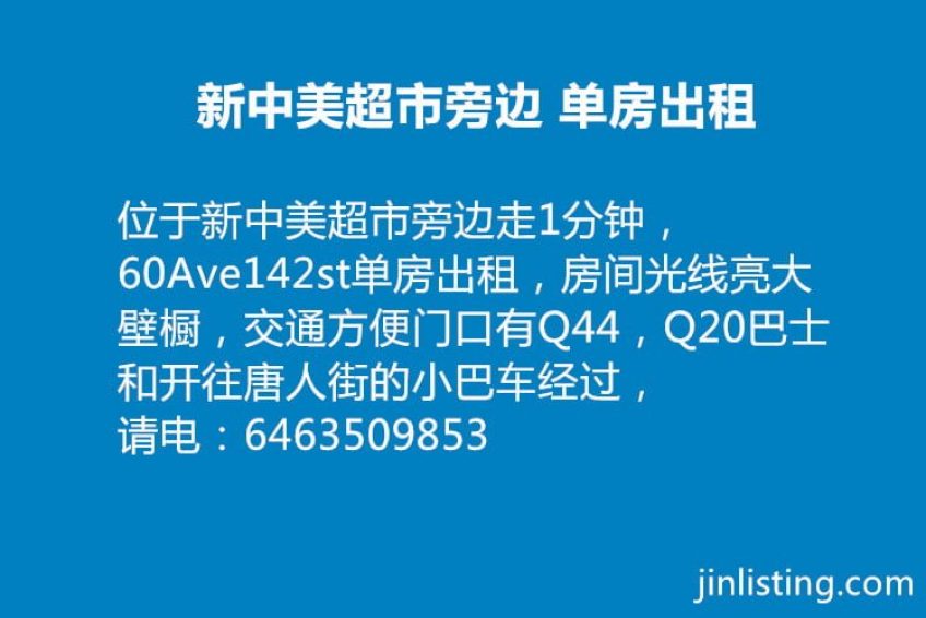 位于新中美超市旁边走1分钟,60Ave142st单房出租,房间光线亮大壁橱,交通方便门口有Q44,Q20巴士和开往唐人街的小巴车经过,请电:6463509853