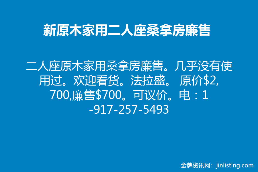 新原木家用二人座桑拿房廉售 “二人座原木家用桑拿房廉售。几乎没有使用过。 欢迎看货。法拉盛。 原价$2,700,廉售$700。可议价。 电:1-917-257-5493。”