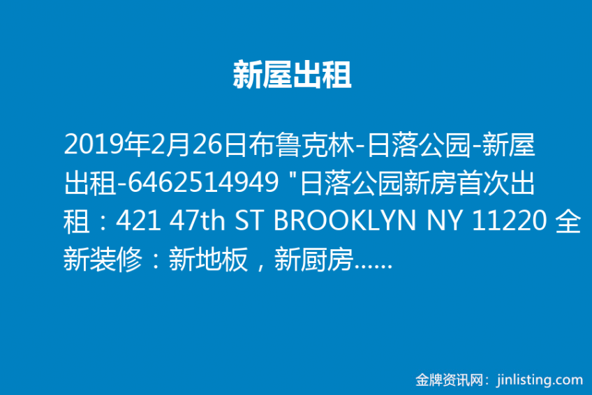 布鲁克林-日落公园-新屋出租-6462514949 “日落公园新房首次出租: 421 47th ST BROOKLYN NY 11220 全新装修:新地板,新厨房,新卫生间,新窗户,… 敞亮,通透: 全新独立水电暖气系统; * 3 楼:4房2卫 + 天窗; * 2 楼:3房2卫 + 大露台; * 1 楼:2房2卫 + 大露台 + 超大花园; * 高挑地下室:2房1卫 + 独立前后门出入+超大花园; 绝佳位置:环境好,生活便利: *** 2个路口地铁N,R,W; *** 步行SUNSET PARK/日落公园,各种商店超市餐饮店; *** 几分钟到 Costco, Industry City