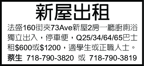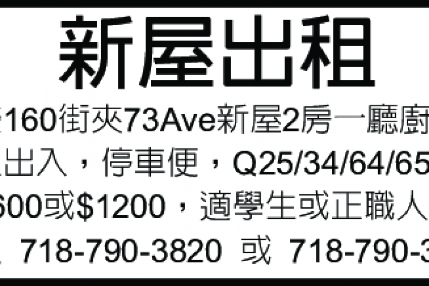 法盛160街夾73Ave,新屋2房1廳、廚廁浴,獨立出入,停車便,Q25/34/ 64/ 65巴士,租$600 或 $1200,適學生或正職人士