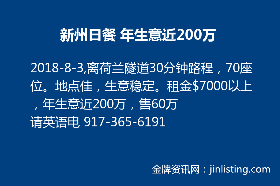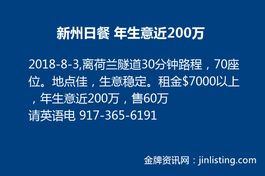 新州日餐 年生意近200万 请英语电 917-365-6191