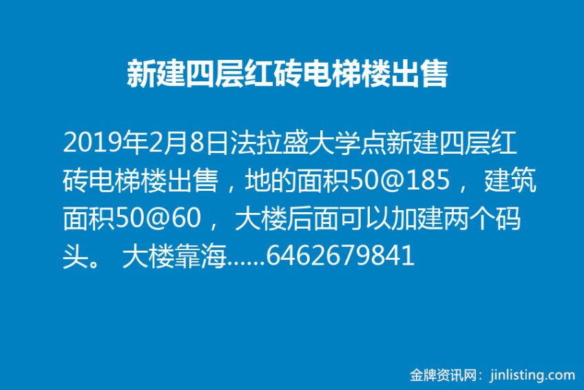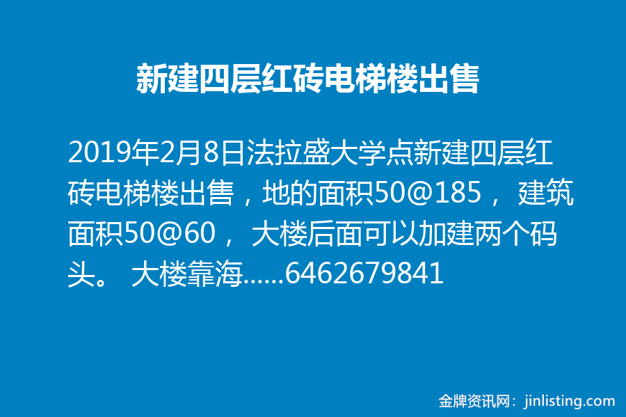 法拉盛大学点新建四层红砖电梯楼出售,地的面积50@185, 建筑面积50@60, 大楼后面可以加建两个码头。 大楼靠海,可以一览曼哈顿全景, 适用于餐馆,夜店和高端酒吧。 大楼楼顶夜景美不胜收, 可做rooftop酒吧。 是一个投资难得的好机会。现售价400万。有意者请联系张6462679841