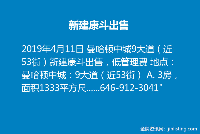 曼哈顿中城9大道(近53街)新建康斗出售,低管理费 646-912-3041 地点:曼哈顿中城:9大道(近53街) A. 3房, 面积1333平方尺 开放式厨房,餐厅,客厅, 2卫浴,8个壁橱,洗衣机和烘干机 欧洲顶级厨柜和欧式炉具,冰箱,洗碗机 大阳台:427平方尺 朝向:南 售价:$275万-$295万(可商议) 可含家具 备注:以上共4套,每楼层1套单元住户, B. 顶层楼中楼(第6层楼中楼):面积1830平方尺,洗衣机和烘干机 欧洲顶级厨柜和欧式炉具,冰箱,洗碗机 3房, 开放式厨房,餐厅,客厅, 2卫浴,8个壁橱, 大阳台:348平方尺 朝向:南 售价: $395万(可商议) 电话:646-912-3041″