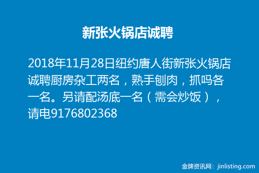 新张火锅店诚聘 纽约唐人街新张火锅店诚聘厨房杂工两名,熟手刨肉,抓吗各一名。另请配汤底一名(需会炒饭),请电9176802368