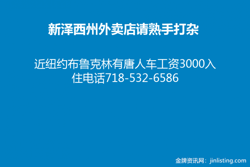 新泽西州外卖店请熟手打杂718一532一6586 近纽约布鲁克林有唐人车工资3000入住电话718-532-6586