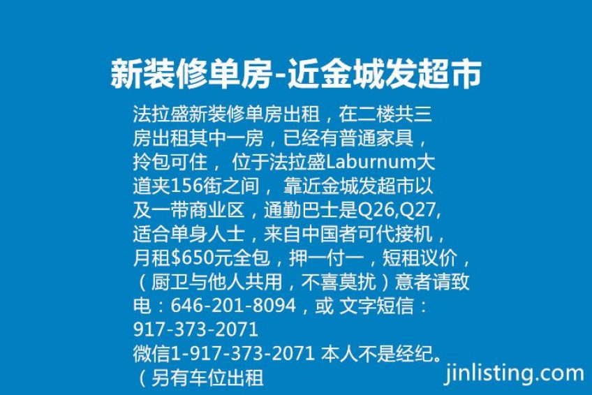 法拉盛新装修单房出租,在二楼共三房出租其中一房,已经有普通家具,拎包可住,,位于法拉盛Laburnum大道夹156街之间,邮递区11355,靠近金城发超市以及一带商业区,通勤巴士是Q26,Q27,,旺中带静,环境优美,无扫街日,泊车非常方便,居住品质优良,入住人口简单,适合单身人士,来自中国者可代接机,月租$650元全包,押一付一,短租议价,(厨卫与他人共用,不喜莫扰)意者请致电:646-201-8094,或 文字短信:917-373-2071 又或添加微信1-917-373-2071 本人不是经纪。(另有车位出租
