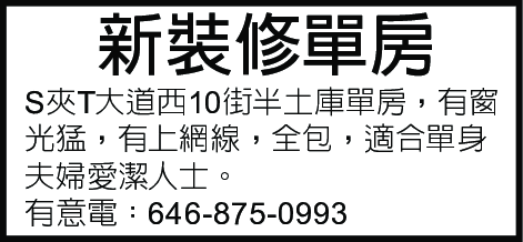 S夾T大道西10街半土庫,有窗光猛,有上網線,全包,適合單身夫婦愛潔人士。有意電646-875-0993