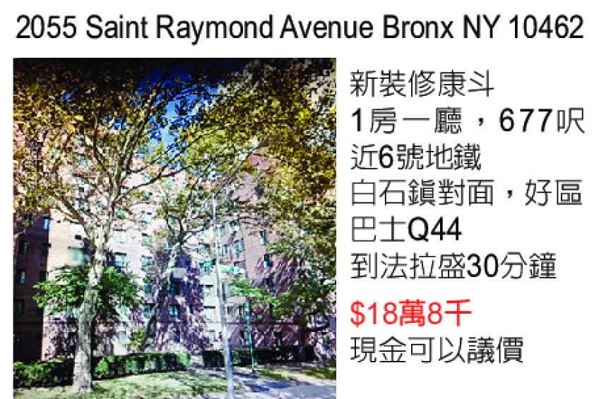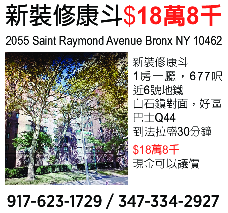 新裝修康鬥,一房一廳,677呎 近6號地鐵,白石鎮對面,好區 巴士Q44到發拉盛30分鐘 18萬8千, 現金可以議價 2055 Saint Raymond Avenue Bronx NY 10462, 917-623-1729, 347-334-2927
