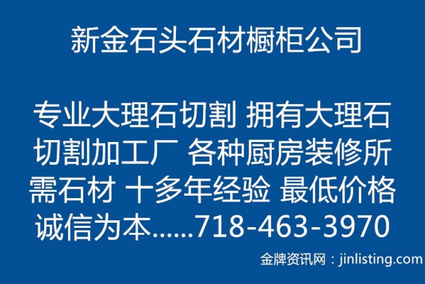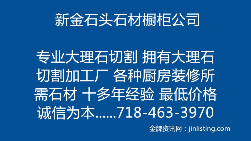 新金石头石材橱柜公司 专业大理石切割 拥有大理石切割加工厂 各种厨房装修所需石材 十多年经验 最低价格 诚信为本 技术一流 联系电话:718-463-3970 516-234-8240