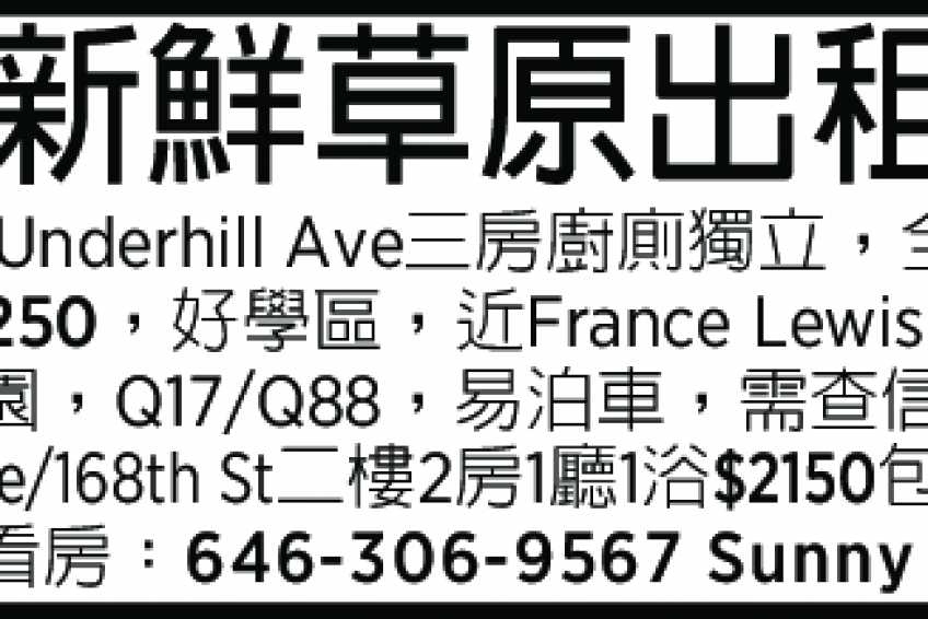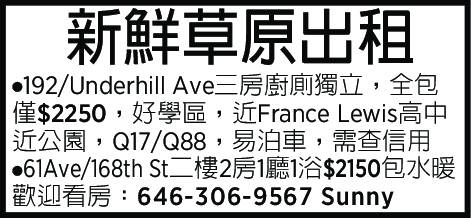 三房,厨厕独立,僅$2250 全包!192/underhill ave,近公园好学区近france lewis 高中Q17Q88易趴車,需查信用。