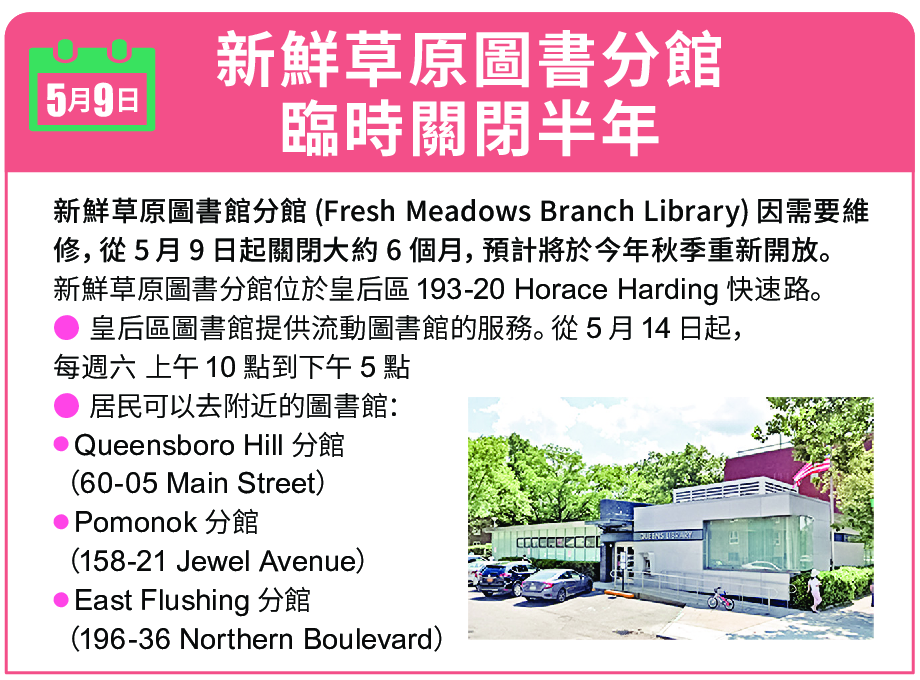 新鮮草原圖書館分館(Fresh Meadows Branch Library)因需要維修,從5月9日起關閉大約6個月,預計將於今年秋季重新開放。