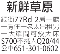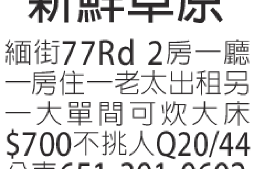 Main街77th Rd兩房一廳,一房住一老太,出租另一大單間可炊,,大queen床,700刀不挑人,公車Q20、44。651-301-0602