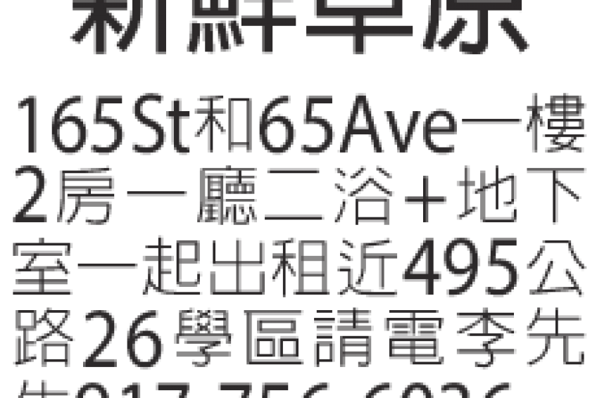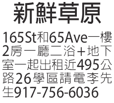新鮮草原 165 St 65Ave,一樓2房1廳2浴+地下室一起出租,近495公路,26學區。917-756-6036李先生