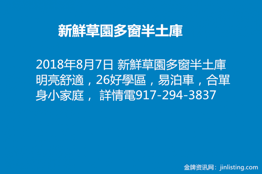 新鮮草園 多窗半土庫,明亮舒適,26好學區,易泊車,合單身小家庭, 詳情電917-294-3837