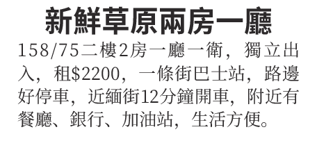 位于158/75 2楼独立出入2房一厅一卫,$2200 一条街巴士站,