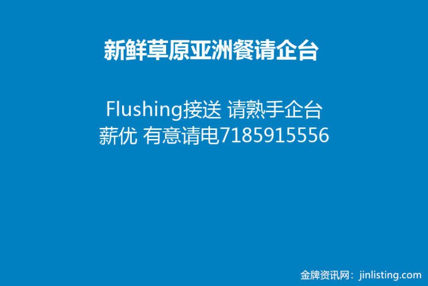 新鲜草原亚洲餐请企台 “Flushing接送 请熟手企台
