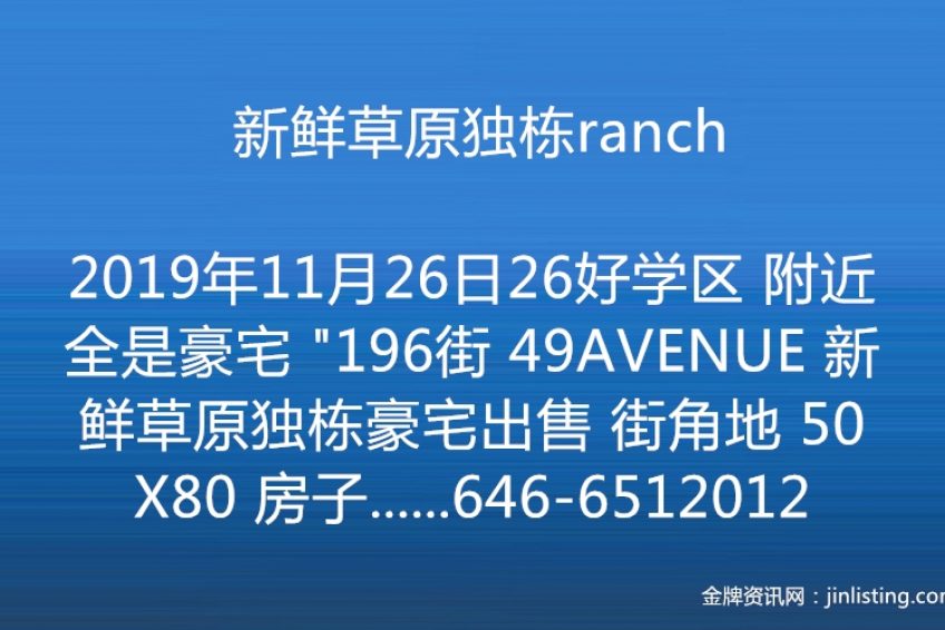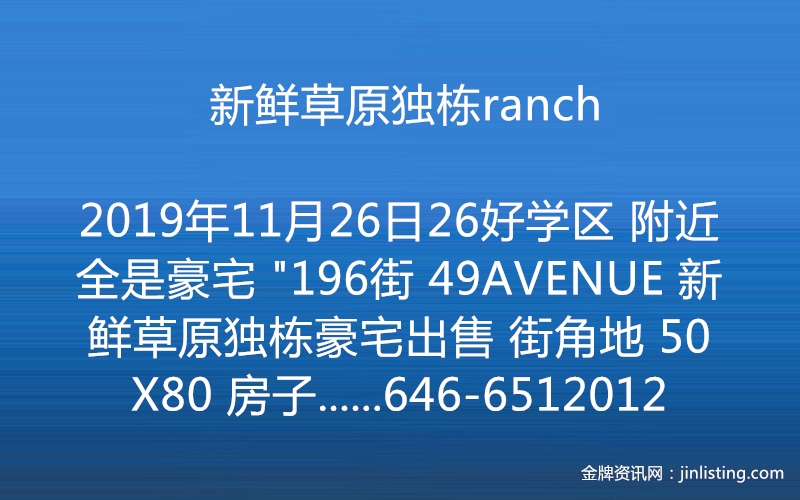 新鲜草原独栋ranch 26好学区 附近全是豪宅 “196街 49AVENUE 新鲜草原独栋豪宅出售 街角地 50 X80 房子 29X42 (还可加建800尺) 一楼三房两厅一卫 basement 1200尺 一大房 一超大厅 一全浴 只要91万, 你可以推倒重建 或者 加建一层 机会难得!!! 请短信联系 646-6512012 随时约看!”