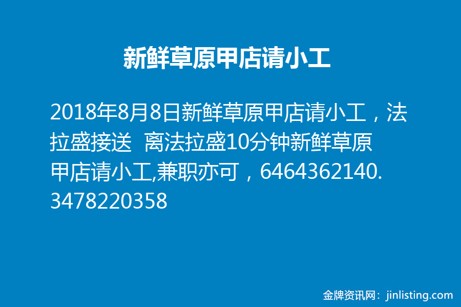 新鲜草原甲店请小工,法拉盛接送  离法拉盛10分钟新鲜草原甲店请小工,兼职亦可,6464362140.3478220358