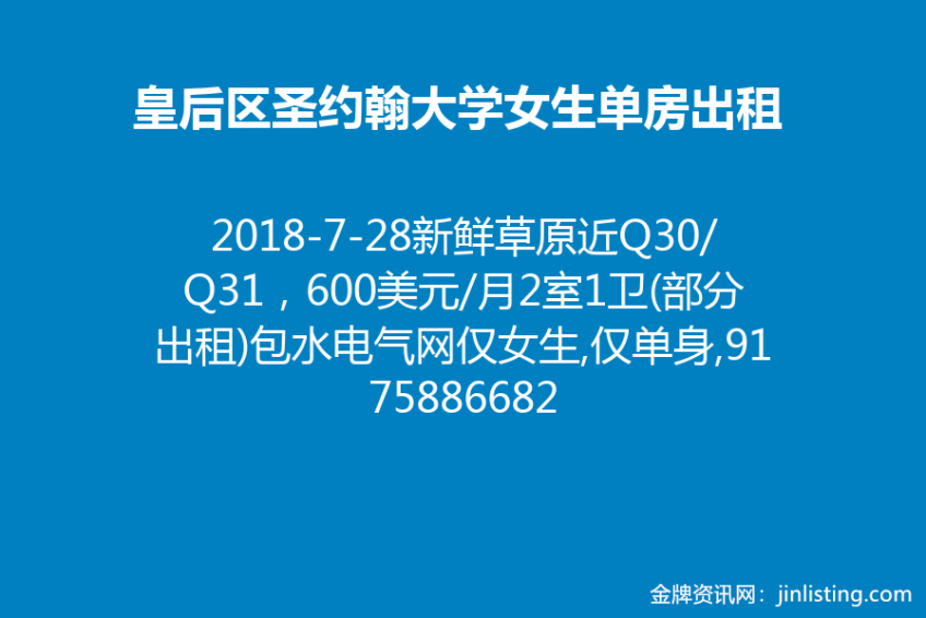 新鲜草原,非常好社区,二楼,全新卫生间,出门就有Q31/Q30,走路5-7分钟有大学银行超市餐馆/Q46等等,一大一小单房出租,全包有家俱,请电9175886682或微信abmj1015