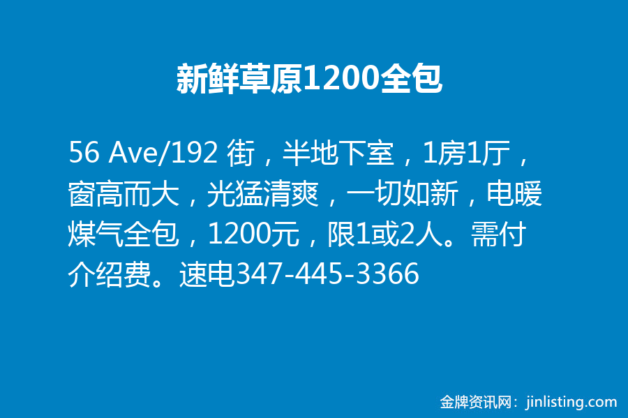 **新鲜草原,56 Ave/192 街,半地下室,1房1厅,窗高而大,光猛清爽,一切如新,电暖煤气全包,1200元,限1或2人。需付介绍费。速电347-445-3366