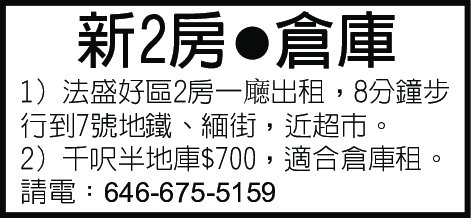 1)法盛好区二房一廰出租、8分鐘步行到7號地铁缅街、近超市 2)千呎半地庫$700、適合倉庫租 請電:646-675-5159