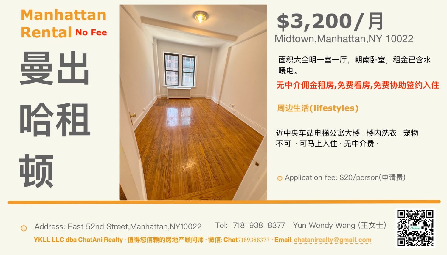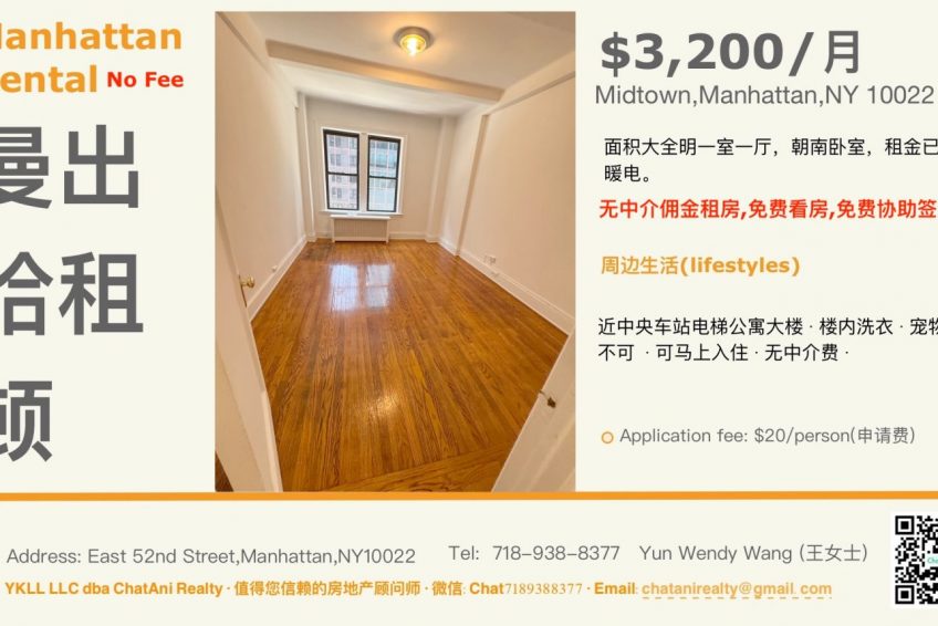 无佣金租房:纽约曼哈顿中城近中央车站一室一厅3200/月包水暖电