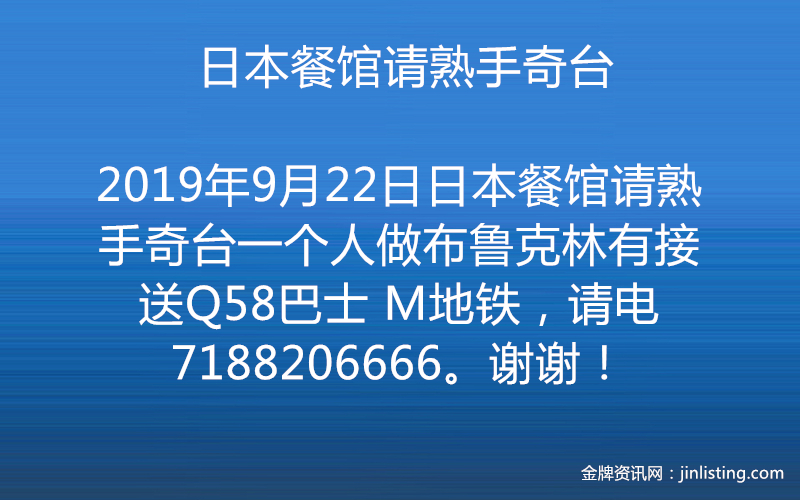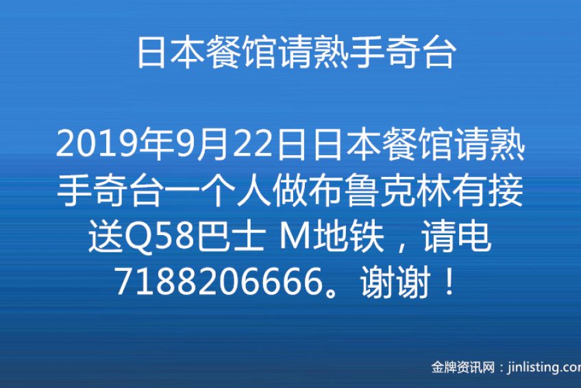 日本餐馆请熟手奇台一个人做布鲁克林有接送Q58巴士 M地铁,请电7188206666。谢谢!