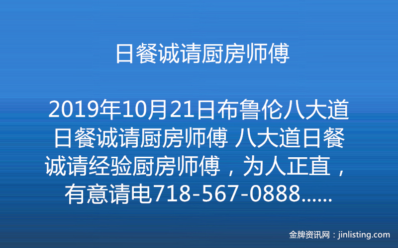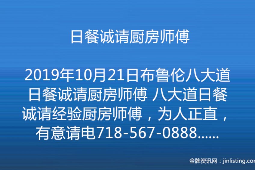 布鲁伦八大道日餐诚请厨房师傅 八大道日餐诚请经验厨房师傅,为人正直,有意请电718-567-0888, 347-257-4634