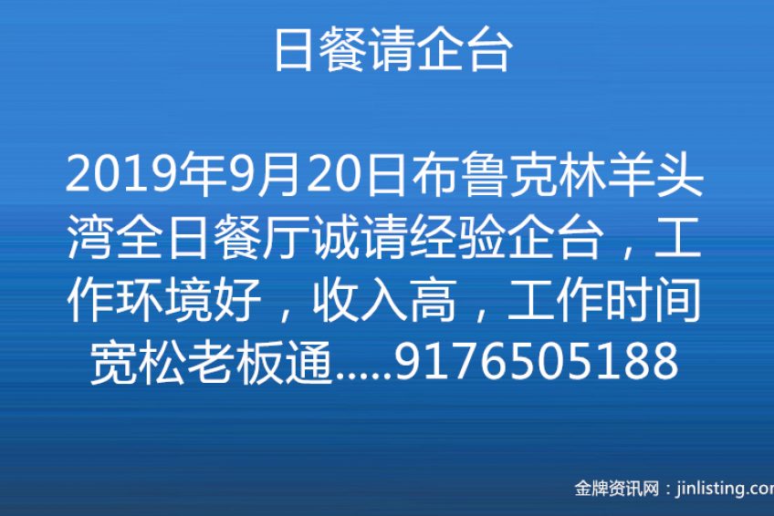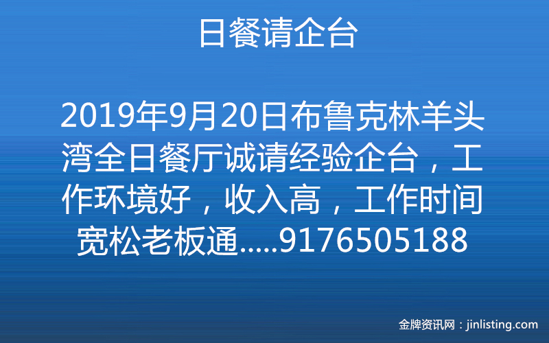 日餐请企台 布鲁克林羊头湾全日餐厅诚请经验企台,工作环境好,收入高,工作时间宽松老板通情达理好相处,有意者请电9176505188,非诚勿扰,餐期勿扰,谢谢,