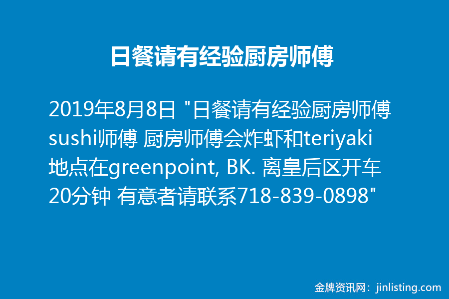 “日餐请有经验厨房师傅sushi 师傅 厨房师傅会炸虾和 teriyaki 地点在greenpoint, BK. 离皇后区开车20分钟 有意者请联系718-839-0898”