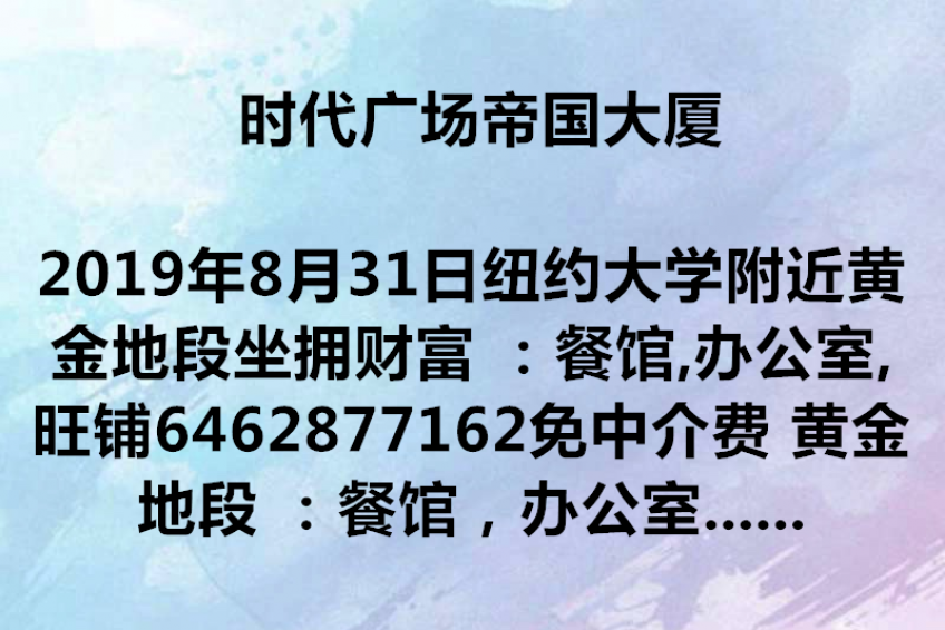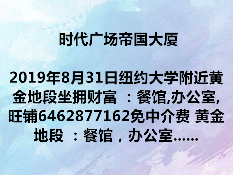“时代广场帝国大厦,纽约大学附近黄金地段坐拥财富 :餐馆,办公室,旺铺6462877162免中介费 黄金地段 :餐馆,办公室,旺铺 举世瞩目最旺旺旺Location! 曼哈顿中城近Time Square 和 Bryant Park 地铁N,R,Q,S,1,2,3,7,A,B,C,C,E,F,S. M都在旁边,周围都是游客。 1͉,【旺铺出租】W38街6 Ave 1500 尺 土库,租金$15000。 3000尺$30000 2,各类大小【办公室】出租W38~40St (5~6Ave)2500尺每尺$38 寻找有实力的创业者! 3近曼哈顿长岛市全新楼店铺889尺$4995 适合甜品,Deli。 4,近曼哈顿独立仓库5000尺寸$24 一尺 5,E82 街1600 尺$13000,适合指甲,按摩店 6,Brooklyn独立仓库5000尺 每尺$24 适合批发公司”