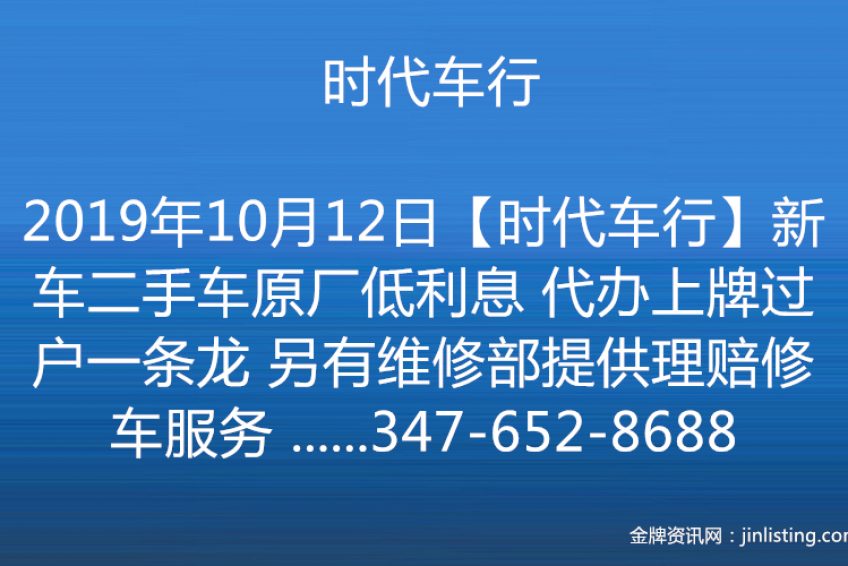 【时代车行】新车二手车原厂低利息 代办上牌过户一条龙 另有维修部提供理赔修车服务 “【Ideal Auto 时代车行】 所有品牌新车保证最低价 最低利息 我们拥有全纽约最强的团队,最完善的售后服务 提供原厂银行贷款,最低可达0%利息 一条龙服务包办保险登记上牌,让您轻轻松松开车回家 另有几千部高品质二手车供您选择 欢迎随时光临! 郑重承诺无任何隐藏费用! 另有维修部 可处理任何交通事故理赔维修 质量可靠 维修期间可帮客人租聘代步车 咨询电话:347-652-8688 微信:zx_1219- 或可扫描下方二维码”