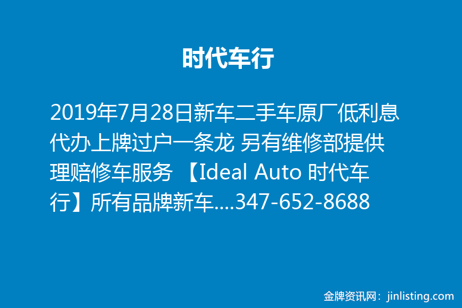 【时代车行】新车二手车原厂低利息 代办上牌过户一条龙 另有维修部提供理赔修车服务 【Ideal Auto 时代车行】 所有品牌新车保证最低价 最低利息 我们拥有全纽约最强的团队,最完善的售后服务 提供原厂银行贷款,最低可达0%利息 一条龙服务包办保险登记上牌,让您轻轻松松开车回家 另有几千部高品质二手车供您选择 欢迎随时光临! 郑重承诺无任何隐藏费用! 另有维修部 可处理任何交通事故理赔维修 质量可靠 维修期间可帮客人租聘代步车 地址:78-14 Woodside Ave, Elmhurst,NY11373 咨询电话:347-652-8688 微信:zx_1219- 或可扫描下方二维码