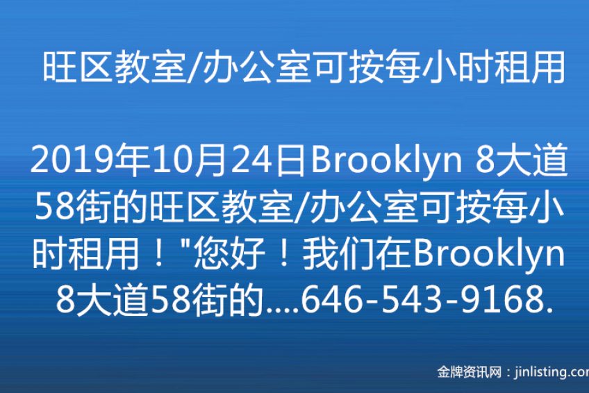 Brooklyn 8大道58街的旺区教室/办公室可按每小时租用! “您好!我们在Brooklyn 8大道58街的旺区黄金地点有宽敞明亮,设施齐全的教室和办公室,如果您是一位老师,正在考虑要在人气兴旺,生源丰富的8大道开您的成人ESL英语课,kids学前班,天才班,课后补习班,周末英数加强班,SAT班,SHSAT班,中文课,美术课,音乐课(钢琴, 小提琴 ,唱歌。。。)等等的项目,我们提供给您这个最经济实用的选择,使您免去了在8大道每月昂贵的房租水电开支压力和教室桌椅设备装修的投资,您只要根据需要使用课室的时间来按小时付费(水电全包),我们最低只收$25一小时,您能挣多少学费都是您的。 欢迎具有教学经验的老师加盟来丰富8大道社区的孩子课后教育课程: (时间自由,学生一般都选在下午放学后或者周末过来。) 成人ESL英语课,学前班,天才班,课后补习班,周末英数加强班,SAT班,SHSAT班,中文课,美术课,音乐课 钢琴 Piano 小提琴 Violin 唱歌 Singing –Subway Directions: Take the “”Coney Island”” bound N train to “”8 Ave”” stop, walk to 58th ST on 8th Ave. Or take the B9 / B70 bus to come. Ms. Liu at 646-543-9168. Thank you! All the BEST!”