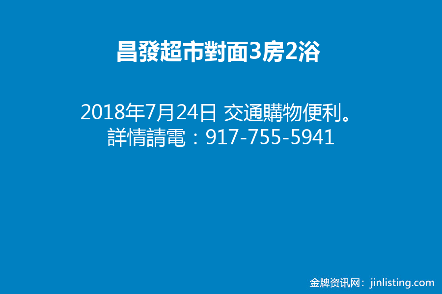 昌發超市對面3房2浴,交通購物便利。詳情請電:917-755-5941